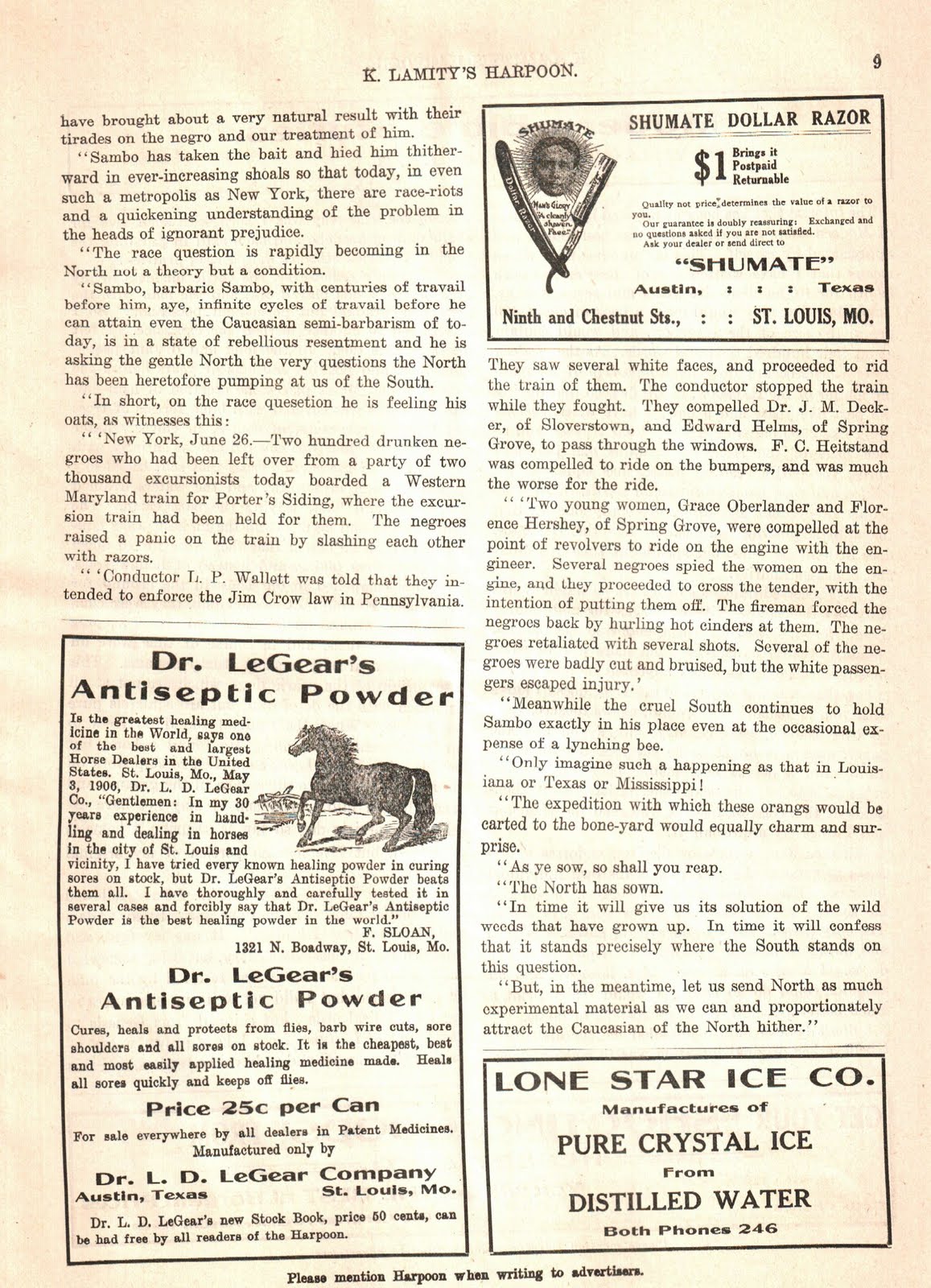At the time K. Lamity's Harpoon was published in Austin Texas in 1906, it had a circulation of 16,500 copies. Their motto was "Minnows Are Safe; I am Out After Whales." It was published monthly by J. S. Bonner. There are some great advertisement for Texas business, some with illustration. I plan to post more in the future, especially the ads. Here are some of the pages. I will be adding more of this newspaper magazine in the future, but for now I will share some of the pages.